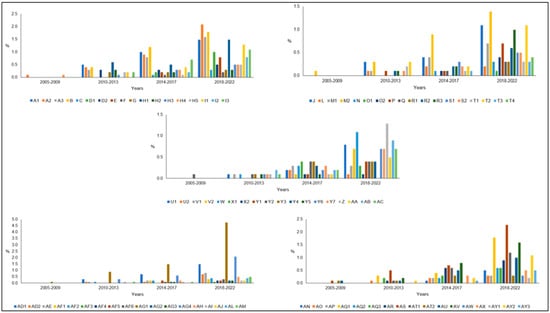 Only the indicators AT2 (trip distance), Y2 (financial evaluation: revenues), AU (traffic), M2 (modal diversity), A2 (accessibility of range), AS (security), and AG1 (air pollution) appeared in the four separation ranges of years (2005–2009, 2010–2013, 2014–2017, and 2018–2022). Some indicators that appeared only between 2018 and 2022 are as follows: O1 (effectiveness of the system), AF3 (monetary policy), AF4 (budget policy), AJ (social projects), AY1 (viability), R1 (environmental management), AW (added value), T4 (energy efficiency), and AL (environmental protection).