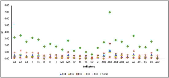 The analysis of indicators revealed higher study frequencies regarding the following: AG1 (air pollution; 6.98%), AS (security; 3.44%), A2 (accessibility of range; 3.49%), B (traffic accidents; 3.16%), A1 (physical accessibility; 3.21%), AG4 (noise pollution; 2.83%), A3 (tariff accessibility; 2.55%), M2 (modal diversity; 2.73%), H1 (energy consumption; 2.88%), and AV (soil use; 2.59%). In relation to the study focus, the following results were obtained (Figure 4):