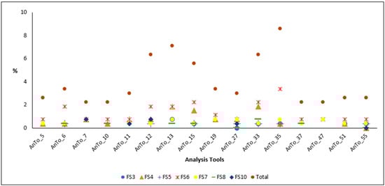 Among the studies, 59 different analysis tools were identified, including AnTo_35 (hierarchical analysis of the process; AHP; 8.58%), AnTo_13 (descriptive and graphic statistical analysis; 7.09%), AnTo_12 (data enveloping analysis; DEA; 6.34%), and AnTo_33 (fuzzy logic; 6.34%). It is noteworthy that the multicriteria decision-making methods obtained a higher frequency (30.97%), having 15 distinct methods.