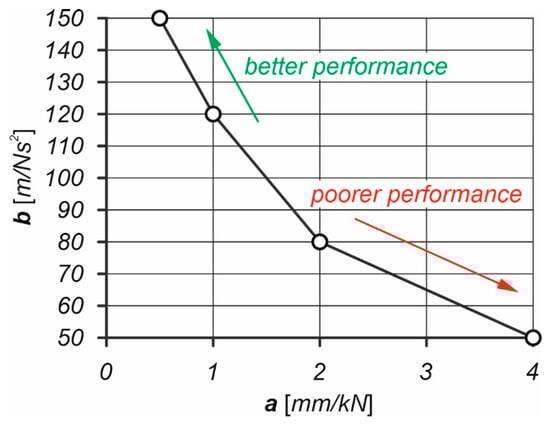 The recommended range of and relationship between a and b is provided in Figure 1. According to EKS 10: BFS 2015:6, the following values may be used: a = 1.5 mm/kN, b = 100 m/(Ns2) [41,42].