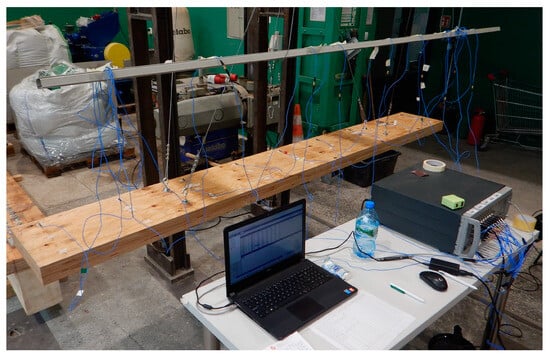 The LVL panels were tested on a steel stand made from two cantilever frames braced with angle sections. The dynamic characteristics of the LVL panels with free ends, suspended with 4 mm steel cables, were investigated (Figure 2). The assumption was that the panel would be tested as a free element, i.e., without supports at the edges. The implementation of such boundary conditions was possible both during the experimental tests and the numerical analyses. During the tests, the tested elements were suspended using flexible cables. The suspension points were selected so that they corresponded with the theoretical nodal points of the first flexural vibration mode of the panel. This is a standard and verified procedure used by dozens of researchers around the world. The stand was used successfully in previous studies on the dynamic characteristics of concrete slabs, steel girders, and steel–concrete composite beams [55,56]. The stand deformability and its effect on the results were considered to be negligible for a free–free scheme [57]. The same boundary conditions were implemented in the numerical model. Most programs, including Abaqus, have no difficulty in solving the eigenproblem for an unsupported structure. There is no need to model suspension cables in a numerical model, which was proven, among others, in the doctoral dissertation [56].