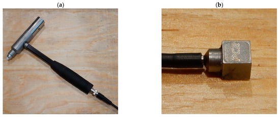(a) Impact hammer (model 086D05, PCB Piezotronics, Depew, NY, USA); (b) Miniature triaxial accelerometer (model 356A01, PCB Piezotronics, Depew, NY, USA).