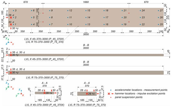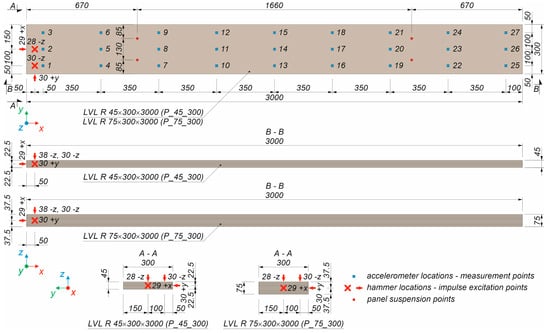 During the tests, impulse excitation was applied using a modal hammer to excite panels into vibration (Figure 3a). The fundamental dynamic characteristics of the LVL panels, i.e., frequency of natural vibration, damping, and frequency response function, were determined. High-frequency results were expected. Therefore, the vibration acceleration was measured, and it was considered to be the response of the panel. Nine PCB 356A01 triaxial accelerometers (PCB Piezotronics, Depew, NY, USA) were attached to the LVL panel using special wax provided by the sensor manufacturer (Figure 3b and Figure 4). Impulses were investigated with excitation generated at four points on the panel, marked in Figure 5 and Figure 6 as: 28 − z vertical impact in the middle of the panel, 30 − z vertical impact on the edge of the panel, 29 + x horizontal impact on the face of the panel, and 30 + y horizontal impact on the edge of the panel. The various excitation points were used to obtain different vibration modes of the panel. Point 28 − z was used to obtain the vertical flexural mode. Point 30 − z was applied to investigate the vertical flexural and torsional modes. Point 30 + y was applied to investigate the horizontal flexural modes. Point 29 + x was used to obtain the axial mode of vibration. A mesh of 27 evenly distributed measurement points was used. The tests were conducted in stages due to the number of points. In one stage, nine sensors measured acceleration at different points placed on the same line. The impulse excitation was generated using a 320 g Modally Tuned, ICP, 086D05 impact hammer (PCB Piezotronics, Depew, NY, USA) with a medium–hard white plastic insert (084B04) tip. For each excitation point, the panels were hit five times. The mesh of the measurement points is presented in Figure 5 and Figure 6. The acceleration responses were recorded using the LMS SCADAS III data-acquisition system (Siemens, Plano, TX, USA). The LMS SCADAS III analyzer was connected to the workstation equipped with a computer-aided system, and the LMS Test Lab package was used to record the signals. The Impact Testing module of the LMS Test Lab package (Siemens, Plano, TX, USA) was used for the impulse tests.