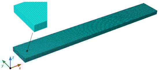 The numerical models of the LVL panels with free ends were developed in the Abaqus program. The analyses were conducted assuming the elastic behaviour of the panels. Each LVL panel was modeled using C3D8I solid first-order elements. C3D8I elements are more effective than C3D8R elements. They make it possible to use a smaller number of finite elements per slab thickness compared to C3D8R elements [58,59]. Their standard shape functions were supplemented with so-called bubble functions to eliminate shear locking. The maximum mesh size was limited to 15 mm (Figure 7).