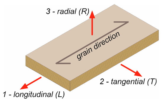 Three main material directions: 1—longitudinal (L), 2—tangential (T), and 3—radial (R).