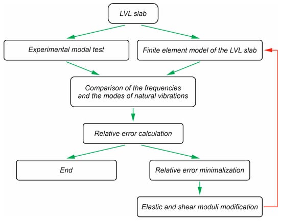 The use of LVL panels in building structures requires a precise determination of their stiffness. An appropriate structural system stiffness is necessary to meet the serviceability limit state requirements for both static and dynamic loads. The stiffness of a structural system is a function of the longitudinal modulus of elasticity. It can be determined based on the knowledge of the basic dynamic characteristics, i.e., the frequency and mode of natural vibrations. These characteristics can be determined using experimental modal analysis techniques and force impulse. In this study, the basic dynamic characteristics of the LVL panels were determined, which allowed for the development of reliable numerical models. The modes of natural vibrations and frequency values obtained from the laboratory tests and numerical analyses were compared. The elastic and shear moduli of LVL were identified through an optimization process in which the error between the frequency values from the laboratory tests and the frequency values from the numerical analyses was minimized. To compare the mode shapes of vibration from the laboratory tests and numerical analyses, the modal assurance criterion (MAC) was used [50,51,52,53,54]: