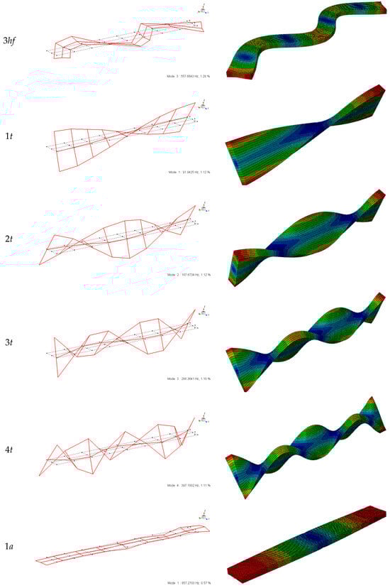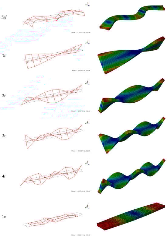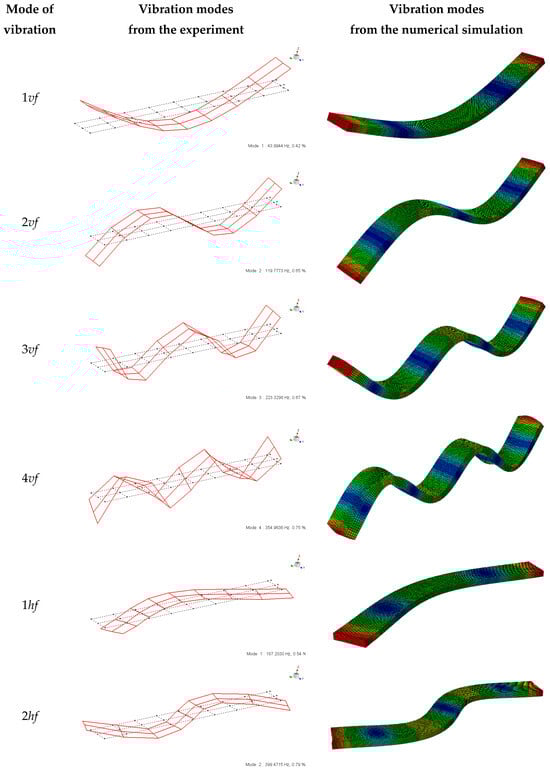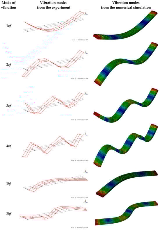The experimental natural frequencies and the results of the numerical analyses are summarized in Table 4. The symbols used in Table 4 and Figure 10, Figure 11, Figure 12 and Figure 13 are the abbreviations of vibration modes. The following types of natural vibrations were analysed: vf—vertical flexural, hf—horizontal flexural, t—torsional, a—axial. The vibration modes of the P_75_370 LVL and P_75_300 LVL panels predicted in the experiment and in the finite element analysis are presented in Figure 10 and Figure 11. The small values of the relative error indicate good agreement between the results of the numerical analyses and the laboratory tests. The modes from the numerical analyses were consistent with the experimental modes. To limit the number of figures, the modes from the numerical analyses of the P_45_370X LVL and P_45_300 LVL panels were not included in this paper. However, they were also consistent with the experimental modes.