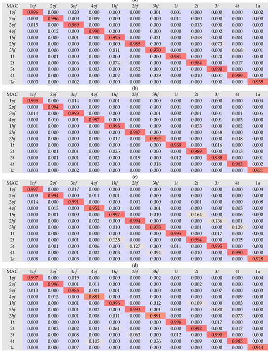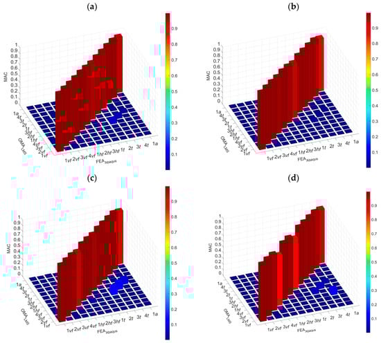 MAC matrixes for four LVL panels: (a) P_45_300; (b) P_45_370X; (c) P_75_300; (d) P_75_370.
