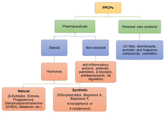 PPCPs are classified into many groups according to their purpose and properties (Figure 2). The group of pharmaceuticals includes antibiotics, antiviral drugs, hormones, analgesics and beta-blockers, anti-inflammatory drugs, cytostatic drugs and regulators of blood lipid levels. Personal hygiene products include preservatives, insect repellents, bactericides and disinfectants, fragrances, and UV sun filters [25].