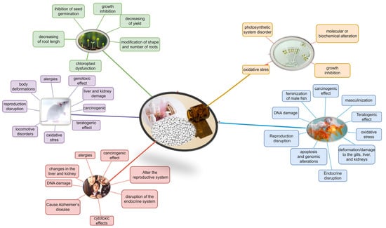 The toxic effect of PPCPs in the environment, including water, is observed in aquatic organisms (fish, invertebrates, and algae), animals and humans (Figure 4). Genotoxic and carcinogenic effects, disruptions to the hormonal, reproductive and behavioral systems, and many other effects have been reported [18,36,37,38,39]. In addition to being toxic to aquatic organisms, pharmaceuticals can also be phytotoxic. Phytotoxicity may vary between plant species and depends primarily on sorption kinetics, soil pH and organic matter content. Physicochemical and biological PPCPs’ properties depend on a variety of environmental factors [18]. The phytotoxicity of PPCPs manifests as a reduction in growth and yield, a modification of roots, and a disruption of the photosynthetic system. Currently, little is known about the behavior of the majority of drugs in soil. The sorption of PPCPs to soil colloids depends on pH, soil temperature, the organic matter content, and granulometric composition [20].