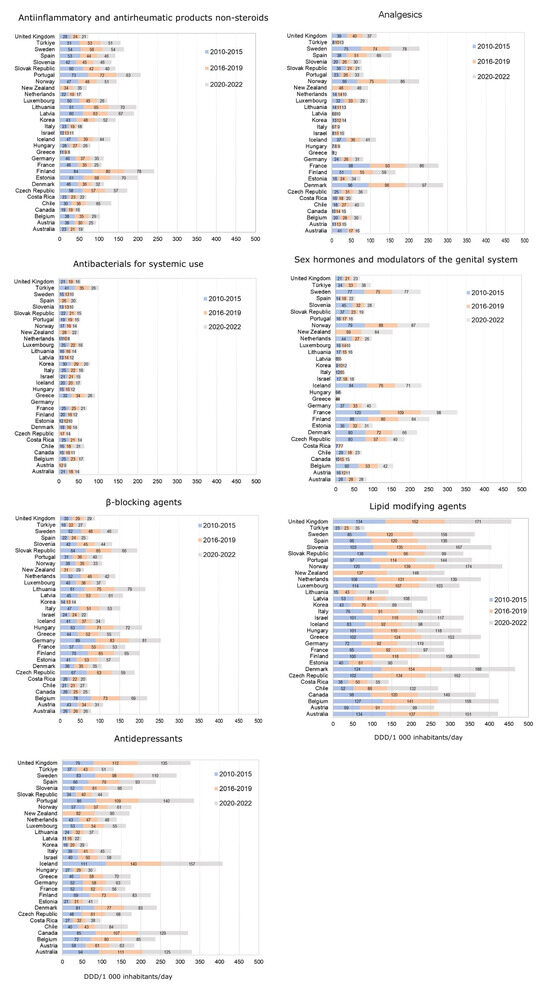 Average consumption of pharmaceuticals from different groups (in defined daily dosage per 1000 inhabitants per day) in different countries from 2010 to 2022.