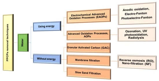 Taking into account the above, the aim of the review is to indicate various aspects of the occurrence of PPCPs in different water bodies such as wastewater, freshwater (rivers and lakes) and groundwater, including their diversity, sources of entry, toxicity and the methods of their removal from water and wastewater. The work pays particular attention to the possibilities of applying different analytical methods, including physical and chemical and their combinations in relation to various PPCPs and energy consumption, and also highlights the importance of green technologies in removing the discussed organic micropollutants.