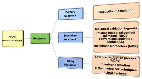 WWTPs, as a rule, operate a single-stage, two-stage and optionally three-stage wastewater treatment system. A three-stage wastewater treatment system is most often used when high-quality water is obtained for specific purposes (e.g., for reuse, for irrigation or recreation). This is usually associated with a higher cost of treatment [11,110]. In general, techniques for the elimination of PPCPs residues in the drinking water production process include slow filtration with sand filters, ozonation, techniques based on the advanced oxidation process (AOPs) and electrochemical oxidation, adsorption on granular activated carbon (GAC) and membrane techniques, in particular nanofiltration and reverse osmosis. In the case of wastewater treatment, conventional biological processes are often insufficient. Therefore membrane bioreactors are recommended [111].