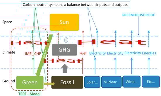 The techno-economic model of renewable forests (TERF) supports the green transition and society’s energy system transition to avoid climate warming. The red dotted line depicts this study. The line arrows are energy inputs and the dotted arrows are energy outputs.