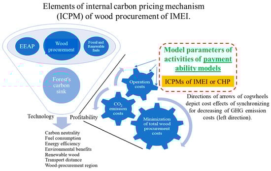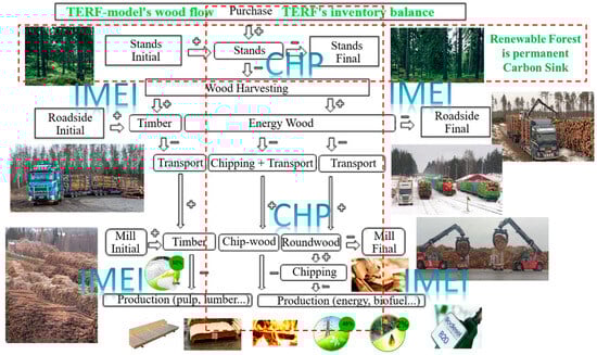 Alongside the implementation of standards for environmental and energy management, the fostering of renewable energy sources on energy use in the IMEI has happened by using the European Emissions Trading Scheme [,]. For renewable forests, the carbon neutrality of wood procurement technology simply means that the relative calculation difference between the largest sustainable and realized wood harvesting amounts (m3/m3) is more than one. In addition to the carbon neutrality of technology, the TERF Model should be used to optimize the profitability of wood procurement by considering all cost and revenue elements (EUR/m3) of WSCs. This can be achieved through payment ability models for pricing mechanisms [], facilitating profitability management in wood procurement for the IMEI (Model 1).