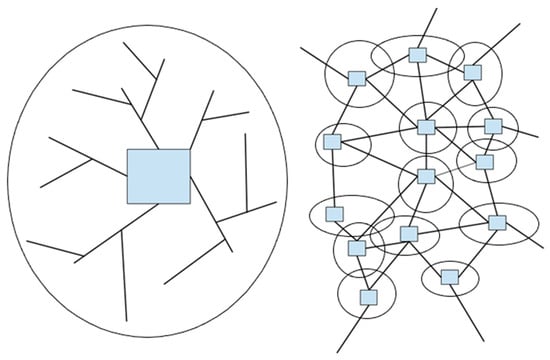 The automation of Finland’s whole energy system has been developed toward a de-centralized infrastructure (Figure 3). In a centralized system, one energy plant operates, while in a decentralized system, instead, a network of many CHP plants operates, which have their own energy wood procurement areas [,]. The decentralized system diversifies the use of energy fuels, processing both heat and electricity in numerous small units that form an energy network. At the same time, the utilization of bio, wind, and solar energy can be increased, and rural employment can be provided. Decentralization also introduces flexibility to the energy system, i.e., electricity can be transferred in two directions in the network. In this way, fluctuations in consumption and processing can be smoothed out. The goal is the so-called intelligent network or smart grid [].