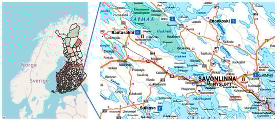 The research material was collected from Eastern Finland, which is located near the Russian border. In this area, the competition between plants of the IMEI that use wood as raw material has increased since the importation of wood from Russia stopped. Even during the pandemic, the share of imported wood was 10–15% of all wood used []. Savonlinna is a typical small city with a well-functioning CHP plant and district heating network. The plant also supports electricity supply for several sparsely populated municipalities (Figure 5). In order to ensure the security of energy supply in the area, the procurement of wood fuel must be increased in the municipalities surrounding Savonlinna, taking into account the sustainability of wood procurement. The plant organization’s strategy also aims at autonomous operation and increasing the resiliency of operations. Logistics faces specific challenges in the operating environment, as waterways may prevent direct wood transport from the forest to the CHP plant.