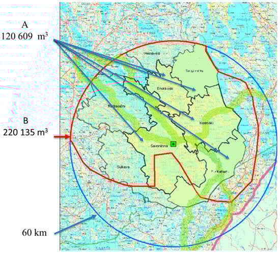 In Finland, inventorying of the country’s forests has been recorded for a long time, from which sufficiently accurate predictions can be obtained for the wood procurement planning of both the wood-processing industry and wood-burning plants. In addition to quantities, predictions are also made for the annual growth of forests []. The Natural Research institute of Finland publishes these open statistics based on the municipality and wood assortment (Table 1) []. For this study, two forest inventory materials were collected from the municipalities surrounding Savonlinna. Table 1 presents the growth of forests as a percentage of the amount of industrial wood. Table 2 presents the area’s energy wood potential for energy conversion plants. In this study, it is assumed that the growth in Table 1 can be used to calculate annual sustainable wood procurement amounts as well as the wood assortment amounts in Table 2.
