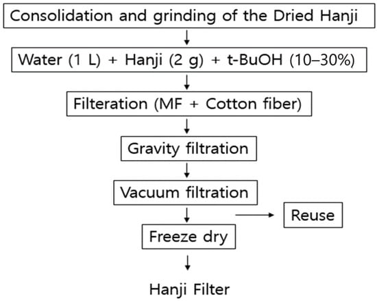 The production process of the Hanji filter is summarized in Figure 1. The dried Hanji was pressed at ~100 °C and then pulverized. An amount of 1 L of water was mixed with the pulverized Hanji, and 10–30% t-BuOH (Daejung Chemical, Siheung, Republic of Korea) was added. This mixture was stirred for ~1 h to prevent the Hanji fibers from clumping together. The mixture of Hanji fiber and t-BuOH was filtered through a filtration device. The bottom of this device was lined with a microfiltration (MF) membrane, and the top was coated with a fiber mixture of 70% cotton and 30% polyester. The membrane was used to slow down the permeation rate, whereas the fiber mixture was applied as a base layer for later transfer to a freeze dryer. The Hanji fibers, not settled by gravity, were finally vacuum-filtered to reduce their moisture content, and the filtrate was reused in a cyclical manner. The Hanji caught on the filter paper was transferred to a freeze-dryer along with the filter paper and then freeze-dried. During the freeze-drying process, the moisture and t-BuOH evaporated, leaving behind spaces that resulted in porosity. Through this process, an 18 cm x 18 cm Korean paper filter is manufactured. The following flowchart depicts the production method for the porous Hanji filter: