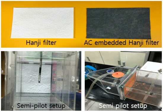 Developed Hanji filter and AC-embedded Hanji filter (above); semi-pilot experimental setup for fine dust removal test (below).