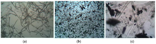 Microscopic images of prepared Hanji filter samples: (a) Hanji filter, (b) Mixed solution with AC and crushed Hanji, (c) AC-embedded Hanji filter (×100).