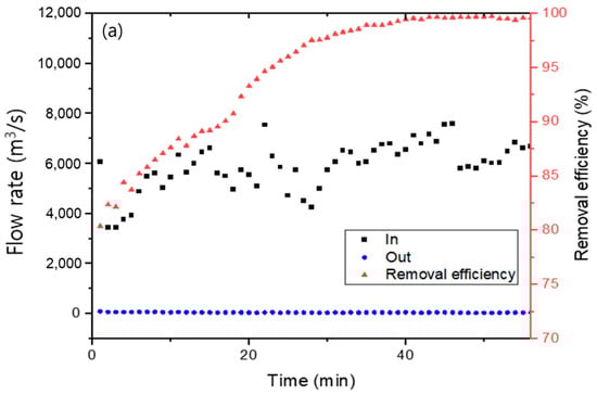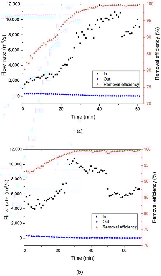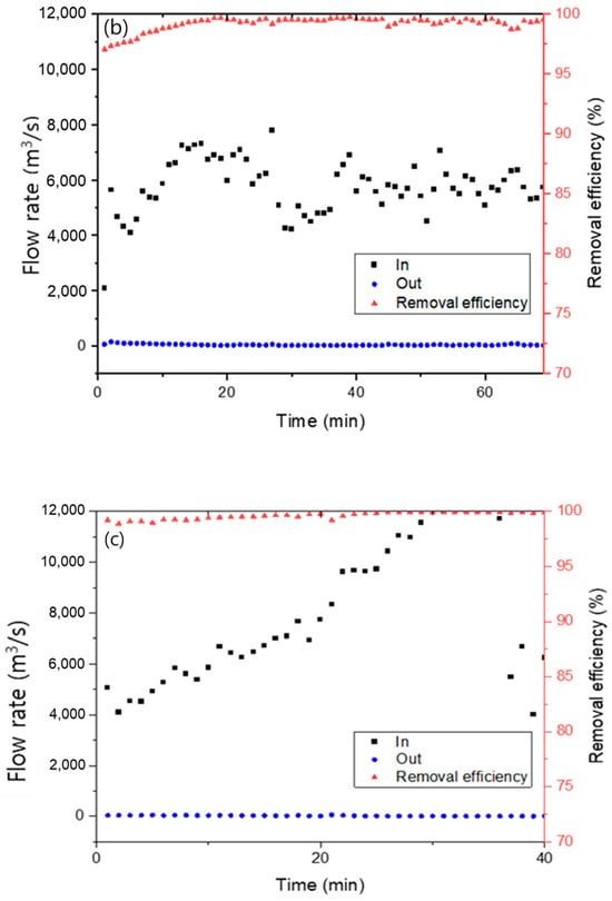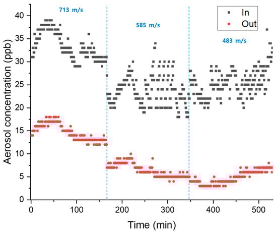 An experiment to remove an aerosol was conducted using a large-scale dust removal device to determine the optimal linear velocity. After installing the manufactured Hanji in a commercial dust removal facility, the concentration of the aerosol before and after removal by the Hanji filter was measured at various linear velocities (713, 585, and 483 cm/s), as shown in Figure 5. The concentration distribution of the incoming aerosol was 20–40 ug/m3, and the outflow concentration was 10–20 ug/m3 at 713 cm/sec linear velocity. For linear velocities of 483 cm/s and 585 cm/s, it was less than 10 ug/m3. The removal efficiency of the filter at the three different velocities was 63.3% at 713 m/s, 72.76% at 585 m/s, and 81.06% at 483 m/s, showing that it appears to increase as the linear speed decreases. Typically, in South Korea, the concentration of dust particles smaller than 10 µm in the atmosphere is ~50 µg/m3. Alerts or warnings for fine dust are issued when the concentration exceeds 100 µg/m3 [].