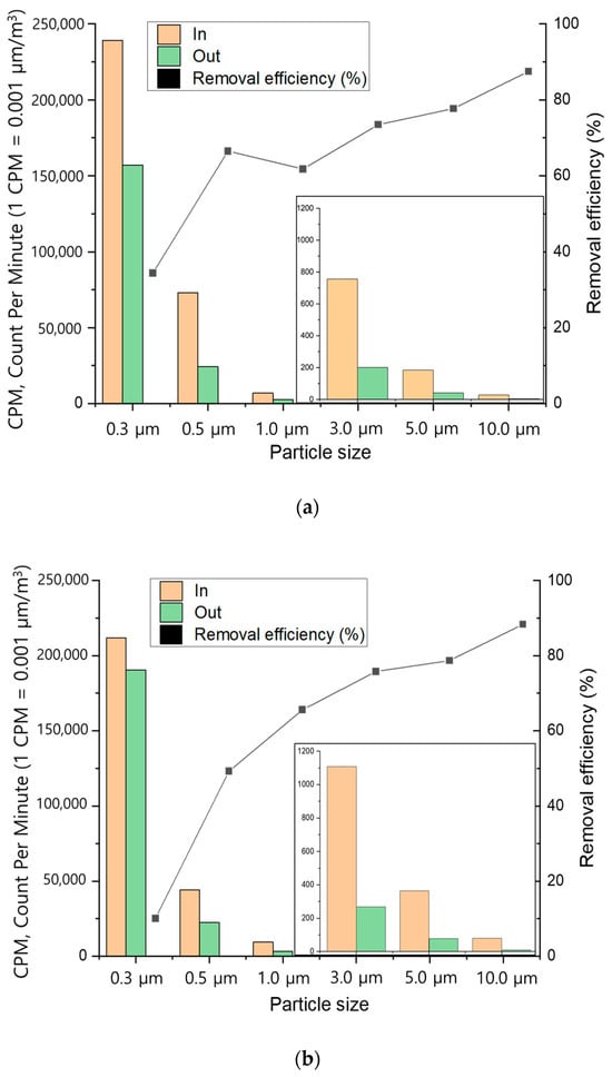 Fine dust removal test results of Hanji filters according to dust size by (a) 1.2 g of Hanji filter content (3.1 mg/cm2), (b) 1.8 g of Hanji filter content (5.6 mg/cm2).