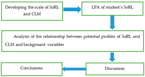 The research process is described as follows. First, this study used the method of project analysis and factor analysis to develop the SoRL scale and the CLM scale. After that, the LPA method was used to classify the learners’ SoRL profiles, and the multiple logical regression method was used to establish the relationship between each subtype and the influencing factors to provide support for the progressive learners to a better type. The flow chart of the research process is shown in Figure 1. This study used Mplus 8.0, SPSS 25.0, and AMOS 24.0 to analyze the data.