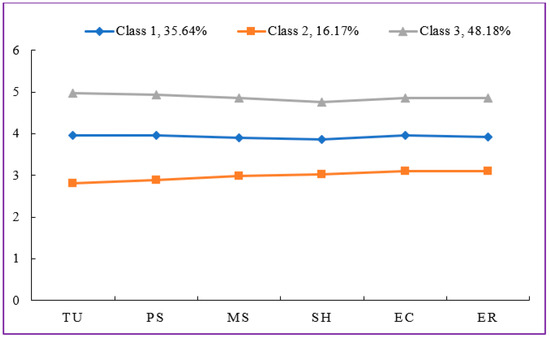 This study used fitting indices and standards to select the best profile model. The data were sequentially input into codes with different numbers of categories for analysis. The fitting indices of potential profile models for categories 1–5 are shown in Table 3. Overall, from the perspective of model fitting, the values of AIC, BIC, and Akaike’s Bayesian Information Criterion (ABIC) decreased as the number of categories increased. From the perspective of model classification accuracy, the entropy values for categories four and five were the highest. In terms of model fit significance, the BLRT values for categories two and three were significant, but the AIC and BIC values for category three were smaller. The LMRT showed that the three-profile model was more suitable for the data than the two-profile model, and the three-profile model had lower AIC and BIC values and higher entropy values. In addition, the sample size of the groups and the theoretical interpretability were examined, and the result of the three profiles was optimal.