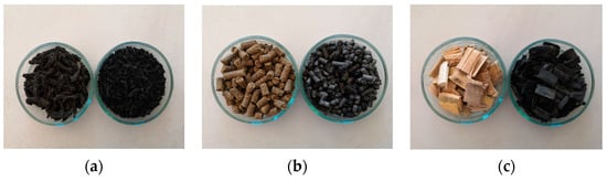 The bio-substrates and biochars are: (a) digestate; (b) waste of biodiesel production from rapeseed; and (c) corn stalks, where on the left side of pictures—bio—substrate and on the right side—prepared biochar.