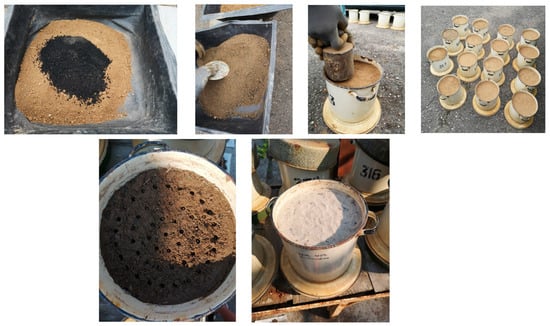 Preparation of the pots’ experiment: preparation of substrate, soil compaction, pots preparation for planting, sowing (from left to right).