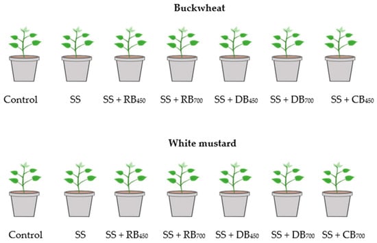 Scheme of the pots’ experiment. Note: Control—soil without any amendments; SS—sewage sludge; RB450—rapeseed biochar at 450 °C; RB700—rapeseed biochar at 700 °C; DB450—digestate biochar at 450 °C; DB700—digestate biochar at 700 °C; CB450 and 700—corn stalk biochar at 450 °C; and 700 °C.