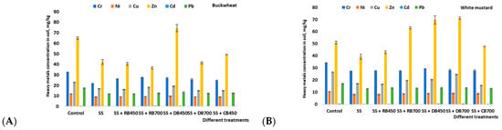 The concentration of heavy metals (mean ± standard deviation) in the soil after growing buckwheat (A) and white mustard (B). Note: SS—sewage sludge; SS + RB450—sewage sludge + rapeseed biochar at 450 °C; SS + RB700—sewage sludge + rapeseed biochar at 700 °C; SS + DB450—sewage sludge + digestate biochar at 450 °C; SS + DB700—sewage sludge + digestate biochar at 700 °C; SS + CB450 and 700—sewage sludge + corn stalk biochar at 450 °C; and 700 °C.