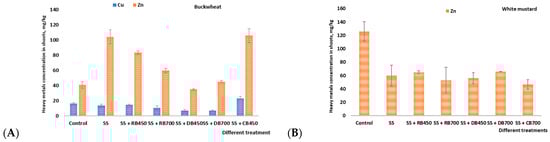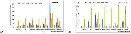 The heavy metals concentration (mean ± standard deviation) in buckwheat (A) and white mustard (B) shoots after biochar incorporation. Note: SS—sewage sludge; SS + RB450—sewage sludge + rapeseed biochar at 450 °C; SS + RB700—sewage sludge + rapeseed biochar at 700 °C; SS + DB450—sewage sludge + digestate biochar at 450 °C; SS + DB700—sewage sludge + digestate biochar at 700 °C; SS + CB450 and 700—sewage sludge + corn stalk biochar at 450 °C; and 700 °C.