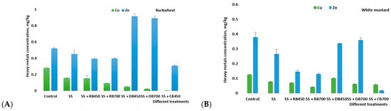 According to the literature, both buckwheat and white mustard have been observed to serve as efficient phytoremediators for heavy metal extraction from soil []. Results from our study showed that plants’ roots act as a buffer and hold back contamination from the aerial parts. In both plants, only two heavy metals—Cu and Zn—were detected in the aboveground biomass; as opposed to the data observed in these plants’ roots (Figure 6). Being exposed to trace elements, Cu and Zn happen to be more extensively absorbed from the substrate by crops than the remaining elements. Studies have identified that heavy metals are less efficiently transferred into plants because they are more tightly bound by the soil absorption complex. The obtained findings are in line with the research carried out by Patra et al. [], which states that Zn and Cu constitute components of a series of high and moderate accumulations.