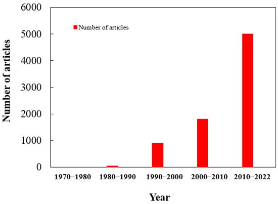 - Initially, a search was conducted on Web of Science and Google Scholar using specific keywords like “slow and controlled release fertilizer”, “coated materials”, “coated urea”, “advantages of controlled-release fertilizers”, “disadvantages of slow-release fertilizers”, and “nitrogen use efficiency”. Further inclusion of relevant articles was based on their pertinence to the review’s topic. Figure 1 provides a depiction of the article count from 1970 to 2022.