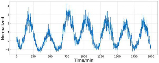 To optimize the model training outcome, utilize EMD to perform stationary decomposition on sample data. Once decomposed, recombine the components into a matrix to be used as input data. Use the min–max scaler method to normalize the input data, and then split the processed data into training and test sets. The normalized data will fall within the range. The specific calculation formula is given as Equation (9).