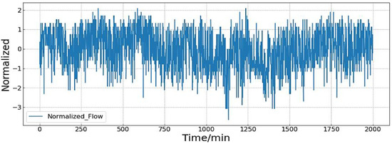 In light of the need for high precision and the capacity for the short-term traffic volume prediction in dynamic environments, the single-point-ahead prediction mode is chosen due to its ability to provide accurate forecasts for immediate future points while minimizing model complexity and uncertainty. In addition, the selection of a 5 min prediction interval for traffic flow, as opposed to longer durations such as 10 min or more, is primarily driven by the need for greater accuracy and reliability in short-term predictions, which are subject to rapid changes due to variables like road incidents, weather conditions, and unforeseen events. Additionally, shorter prediction intervals align better with the requirements of real-time traffic management systems, which demand timely data to make effective adjustments in traffic signal control and disseminate traffic advisories. Therefore, this paper adopts the single-point-ahead prediction mode, that is, based on the previous min short-term traffic volume parameters to predict the traffic flow parameters at the moment. In order to eliminate the impact of different evaluation metrics’ dimensions and avoid oscillations during gradient updates, enabling the network to converge faster, the min–max scaler method is used for normalization. After linear transformation, the results are mapped to values within the range . The distribution of normalized traffic flow and speed is shown in Figure 2 and Figure 3, respectively, and the traffic flow parameter data show a clear periodicity.