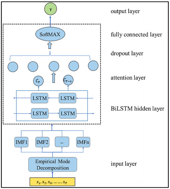 In neural network learning, the more parameters there are, the stronger the model’s expressive ability and the more information it can store. When the neural network model processes excessive information, the application of the attention mechanism allows for the selection of key information, thereby improving the efficiency of the neural network. In this paper, the original data are decomposed through EMD to enhance the data quality as the input to the model. On the basis of the BiLSTM model, the attention mechanism is introduced to calculate different weights for the output vectors of the BiLSTM model’s hidden layer. A short-term traffic flow parameter prediction model based on EMD–Attention–BiLSTM is constructed. The hierarchical structure of the EMD–Attention–BiLSTM model is shown in Figure 5 and mainly consists of the following five parts.