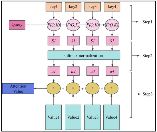 - Stage 1, Calculating Similarity: Based on the query and the input key–value pairs, calculate their similarity . The calculation formula is shown in Equation (11).where: is the query vector of input data;is the key vector for the input data;is the calculation model. Common models include dot product model, represented as ; cosine similarity model, represented as ; and MLP, represented as .