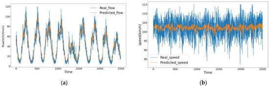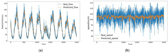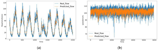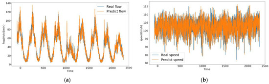 LSTM model prediction results compared with raw data. (a) Predicted results on traffic volume; (b) predicted results of travel speed.