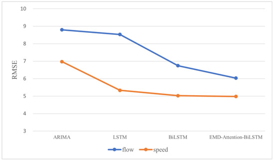 In the same experimental environment, the ARIMA, LSTM, BiLSTM, and EMD–BiLSTM–Attention models were trained and tested on traffic volume and speed. The evaluation metrics RMSE and MAE were computed. The results are presented in Table 1.
