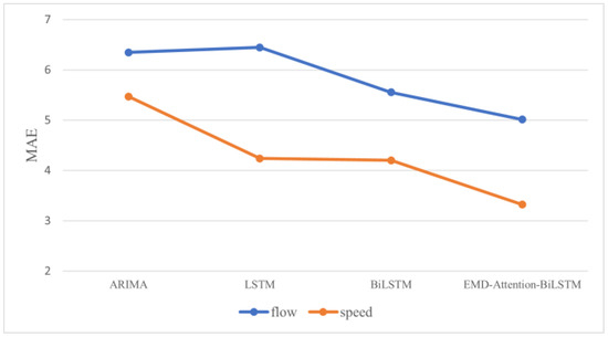 Figure 11 and Figure 12 depict the changes in evaluation metrics for the four prediction models. From these figures, it can be observed that the EMD–Attention–BiLSTM model outperforms the traditional ARIMA model, LSTM model, and BiLSTM model in terms of both RMSE and MAE metrics. From a volume prediction perspective, the EMD–Attention–BiLSTM model shows significant improvements over the ARIMA model, LSTM model, and BiLSTM model. The RMSE metric decreases by 31.4%, 29.2%, and 10.1%, respectively, compared to the ARIMA, LSTM, and BiLSTM models. The MAE metric also decreases by 21.1%, 22.3%, and 9.7%, respectively. From a speed prediction perspective, the EMD–Attention–BiLSTM model performs better than the ARIMA model, LSTM model, and BiLSTM model. The RMSE metric decreases by 28.6%, 6.6%, and 0.9%, respectively, compared to the ARIMA, LSTM, and BiLSTM models. The MAE metric also decreases by 39.2%, 21.6%, and 19.5%, respectively.