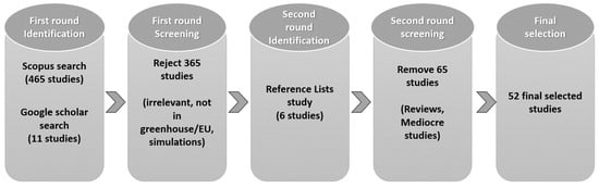 Out of the 465 results from the Scopus search, 365 studies were removed, as they did not meet the criteria to be included in the present review. They were considered irrelevant to the chosen topic, or they were referring to the cultivation of crops in non-conventional GHs (net-houses, non-robust structures), or in open field. Moreover, they contained experiments and analyses in non-EU countries, they performed simulations without actual data, or did not present clear values of CF and environmental impact from the studied systems. Before rejecting these papers, their bibliographic references were studied, with the aim of finding additional suitable papers; hence, six more papers were included in the study. For the final selection, out of the 117 studies (100 from Scopus, 11 from Google Scholar, and 6 from reference lists of rejected studies), 52 papers were chosen, as the remaining 65 studies constituted review papers or papers with some contribution to the purposes of this review, but not eligible for the final selection. Thus, the final selection of papers involved 52 studies on the CF of GH production in the EU.
