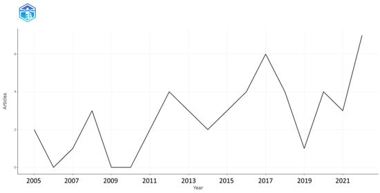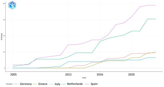 Moreover, the annual scientific production seems to fluctuate over the years (Figure 2), but with a constant rising trend from 2010 and beyond. This is an indication that the domain of the GH CF is indeed active and attracts the interest of researchers and practitioners. Especially as we approach 2050, which is the reference year of the EGD for the reduction in the CF in all sectors of the economy, the rising trend observed after 2010 is completely justified, as long as countries and individuals are moving towards this goal looking for solutions in the agricultural sector.