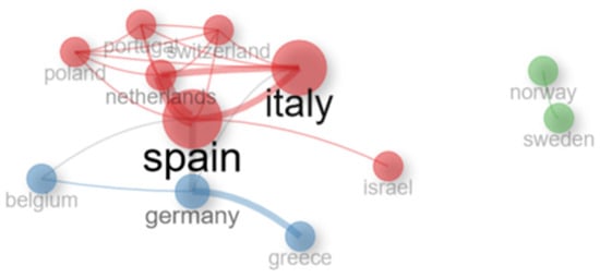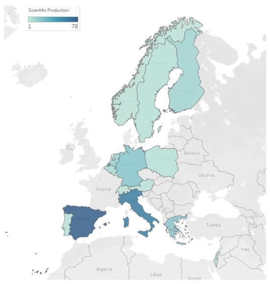 The next goal of the bibliometric analysis was to profile the activity of the collected studies in terms of the collaboration between countries, the scientific production of each country, and the countries that gather the highest number of citations. In Figure 3, the scientific production of each country is presented, where Spain, Italy, Germany, and Greece emerge as the most active countries in the field. This finding can be interpreted under the spectrum that Spain, Greece, and Italy are among the largest producers of GH crops in Europe, which justifies the increased research interest around the calculation of the CF in these countries’ GHs. In fact, Almeria, an area in southeastern Spain, has been marked as the greatest exponent of GH production in Europe [110]. Furthermore, these countries are characterized by a warm Mediterranean climate, which in most cases allows year-round production in GHs, with less need for heating during winter.