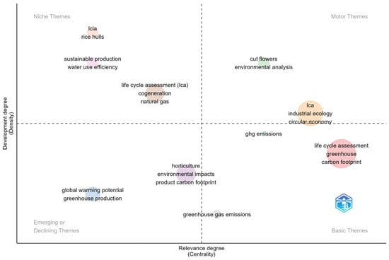 In addition, for the thematic clusters, the methodology introduced by Callon et al. [32] was used, which first computes a co-occurrence network between the author keywords of the collected studies. Then, a community detection algorithm (assigned by the researcher that conducts the analysis) finds communities of interconnected terms. These communities are comprised of keywords and may be connected to each other through shared words. The final step of the algorithm calculates two metrics, namely the Callon Centrality and the Callon Density. The Callon Centrality assesses the association strength of a community with all other communities, i.e., the number of links that the keywords within a community have with keywords from other communities. Conversely, the Callon Density assesses the strength of connections with a community itself, usually calculated by the mean value of internal links [32]. The goal of this methodology is to produce thematic clusters, which comprise interconnected keywords, distributing them into a two-dimensional space and assessing their innovation [32,33,34].