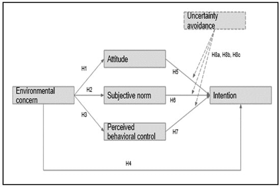 Hence, to evaluate TPB interplays, this research uses uncertainty avoidance as a moderator. Considering the hindrance scenario, we propose an argument that TPB factors may not translate directly to intention, even if consumers are impacted by ECs. According to studies, Indians view vehicle purchases as high-involvement behavior []. Therefore, the aforementioned non-translation often happens during high-involvement transactions in nations where UA is fairly high [,]. As a means of considering this phenomenon, we have included the UA concept in our analysis. Psychological factors such as UA have had mixed results in previous research [], which examined the relationship between TPB variables and intentions. Hence, considering the mixed outputs, to ensure the role of UA in our equation, we present the following hypotheses:
