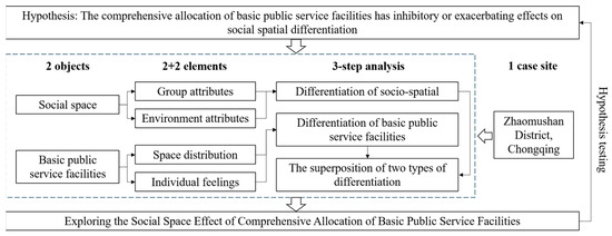 The study will assume that the comprehensive configuration of basic public service facilities has inhibitory or aggravating effects on social–spatial differentiation and select two objects: social space and basic public service facilities, and subdivide the research elements. Select typical case sites and analyze the social–spatial differentiation characteristics, basic public service facility differentiation characteristics, and two types of differentiation superposition characteristics of the case sites to verify the hypothesis (Figure 1).