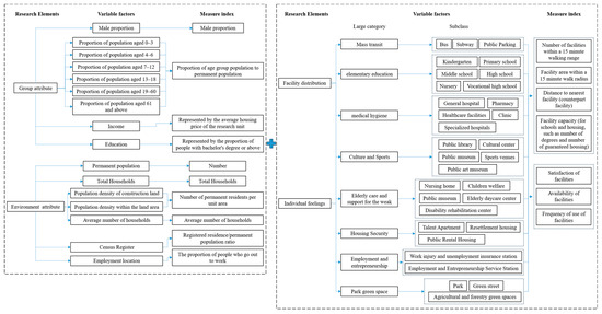 Research selects two types of elements: group attributes and environmental attributes to describe the differentiation of social space. Among them, group attributes include natural attributes and social attributes, with natural attributes referring to the age, gender, health status, etc., of the population. Social attributes refer to the family structure, education level, income, occupation, ethnicity, etc., of the population, which serve as the criteria for dividing social groups. The environmental attributes refer to the total population, residential density, population density, registered residence, employment location, and other attributes related to the environment as the criteria for dividing social space.